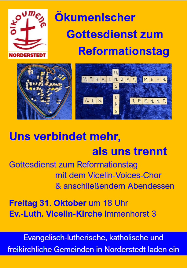 Unter diesem Motto feiern wir den diesjährigen Reformationstag in ökumenischer Verbundenheit am Freitag 31. Oktober um 18 Uhr in der Vicelinkirche, Immenhorst 3 in Norderstedt.